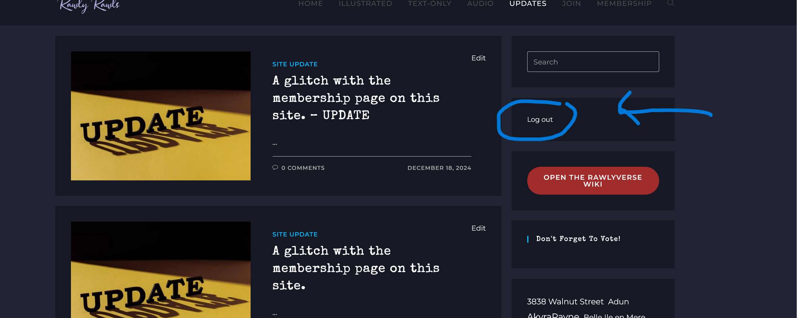 In the meantime, if you need to log in, go to the Updates page on a desktop browser and look to the top right. There is a login button there. I’ll post a picture of it below. Or you can go to this link: https://rawlyrawls.com/login/